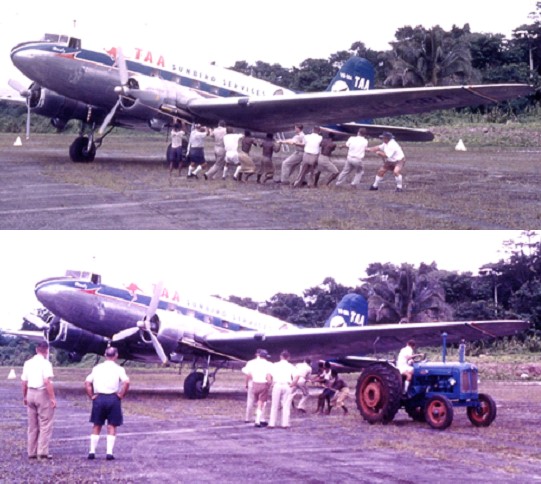 In early 1975, we flew to Rabaul for the centenary of the Methodist Church in the New Guinea Islands. Edna's parents and my parents had been Methodist missionaries before the war. After the function was all over we went to the Rabaul airport to get planes to take us home, in our case, to Port Moresby. There were lots of people from Australia and they were put on the regular passenger DC3s while those from Lae and Port Moresby were put on a cargo DC3. We boarded our plane and sat in the canvas fold up seats along the side of the plane: the centre section was for cargo, however on this trip there was none. On our way to Lae we travelled through heavy rain for some time. We had not realised that the roof of the plane was full of holes so in no time we all had our umbrellas up keeping the rain off us. It was quite a sight looking down inside the plane seeing the passengers with their umbrellas up. Probably the greatest thrill I had regarding flying in New Guinea was when the first plane landed on the airstrip I was constructing at Nuku. The Cessna came through the gap and landed easily on the new airstrip and out jumped the pilot, Bishop Arkfeld, the District Officer, Fred Kaad and an airport inspector. The airport was immediately opened to small aircraft and after the fill had settled and some more drains had been put in I was told it would be opened to larger aircraft. Anything to do with flying in Papua New Guinea is always an experience and sometimes dangerous. It has been an experience I will never forget.