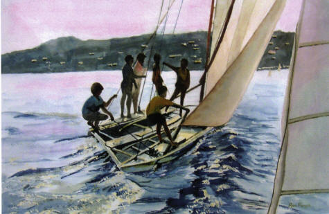So, as I photographed this lakatoi and its exuberant crew sheering past my trailer sailer, I took their hail to be a good-natured gesture of derision. Clearly our Coral Queen was a lame duck and a very appropriate target (as my watercolour faithfully records, our self-furling jib was badly twisted around the forestay!)