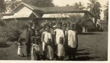 Later in 1934, my mother heard that the Methodist missionary and his wife on the north coast of New Britain, near Cape Hoskins, had not had one baby but twin girls. My mother packed up some baby clothes including some baby dresses and sent them down to the Malalia Mission station for the twins, Edna and Nancy. (Twenty-four years later, I married Edna and now 53 years later again Edna still has a doll wearing one of those baby dresses!!) The house at Pinikidu had four rooms down the middle which were mosquito proof, surrounded by verandahs. At the front of the house in the middle, the verandah was wider and partly enclosed and this was the lounge area. The kitchen was in a separate building at the back joined by a walkway to the house. The bathroom was on ground level near the tanks. At the back of the house there was a large mango tree and beyond this, the garage and a storage room. (After the war, the mission station was not re-established at Pinikidu but a little further down the coast at Kimadan.) In 1969, when I visited Pinikidu the concrete blocks that supported the house were all still in place but the house had been destroyed during the war. I considered the size of a house built on these blocks and thought it was much smaller than I remembered. Then it dawned on me that the last time I saw the house in 1941, I was only 7 and only a small boy and of course, the house would have looked much bigger. The concrete steps that were at the front entrance to the house were still there.