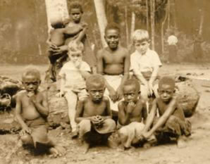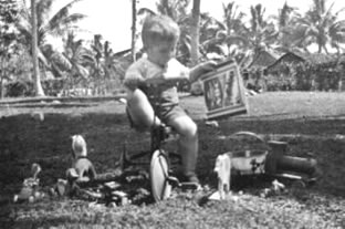 In 1939, Dad constructed two concrete water tanks at each end of our house, one 4,000 gallon and one 5,000 gallon. This gave us a lot more water for household use. (In 1969, when I visited the house site again I found that the hand pump on one tank still worked. The other tank had had a hole cut into it during the war and I believe it was used as a shelter. When we visited the site again in 2002 the hand pump still worked on the tank.) In 1939, we went on the Bulolo to Sydney. All of us children on board had breakfast first before the adults. One morning in Rabaul we were having breakfast when we heard two shots fired. There was a mass exodus by us kids from the dining room whether we had finished breakfast or not. We raced up on to the deck and saw that the Captain had shot a big shark which was not far from where some Tolais were swimming. The shark was then towed around the ship to the shore. None of us kids went back for breakfast. When I was five, Mum started teaching me correspondence lessons from Blackfriars in Sydney. She always had a job getting me to settle down to lessons: I preferred to be outside playing. (I do not think she was very successful in teaching me as I had to start school almost from scratch in Sydney.) I remember in about 1939, I got a lot of tropical ulcers on my legs and I had to rest a lot. Pinikidu had a lot of swamps nearby. (Even now I can see all the scars from these ulcers on my legs.) Our cook at Pinikidu was Iotam who came from the Duke of York Islands. I always got on well with Iotam. (Years later, in 1964, when I was Patrol Officer at Kokopo, I met Iotam again on a patrol to the Duke of Yorks.) In 1941, everyone became worried about the possibility of a war. Japanese ships had been seen around the islands. My mother was not well and it was decided because of the conditions, for her to go to Sydney and take my younger brother, Parker and me with her. Dad decided to stay until 1942 when he would have completed 10 years' service with the Methodist Mission and then resign and join us in Sydney. We left Kavieng on the Macdhui and waved goodbye to Dad. I never saw Dad again. PS. I found that I could remember little of my early life at Pinikidu as I left at 7 years of age. Mum told me quite a bit and I learnt more from letters and papers and especially from my Baby Book in which my mother recorded everything carefully. However, I do remember that I had happy days at Pinikidu.