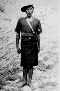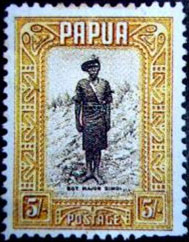 Simoi, the son of Gidau, was born c. 1877 at Katatai Village, Kiwai Island, at the mouth of the lengthy Fly River in the Western District. He joined the BNGAC in 1899 as a Constable on a pay scale of 10/- (ten shillings) with rations a month, followed the following year by a raise to £1.0.0 (one pound) p.m. In 1901 he was a Lance Corporal and soon promoted to Corporal. He took part in many interior expeditions in which he was wounded by arrows on many occasions amongst numerous headhunting and very primitive tribes and, showing outstanding courage, was quickly promoted to Sergeant, this then being the highest rank available for a Papuan. In 1905, together with another Papuan Constable, he was commended for a remarkable feat of bravery in saving the life of the Administrator (Captain F.R. Barton), Judge Hubert Murray and other Europeans when their whaleboat capsized in treacherous heavy seas off Vailala in the Central Gulf of Papua. At a time when Papuan wages on the outstations were extremely low, compared with higher wages in Port Moresby and environs, Simoi left the BNGAC and worked for some years as a native labour supervisor and recruiter in the Central District. Following the foundation of the Commonwealth of Australia in 1901, the Papua Act of 1906 passed the transfer of British administration (though for all intents and purposes this had been carried out by the Colony of Queensland) to Australian rule and created the Territory of Papua. The constabulary was then renamed the ANC. In 1912, Simoi sought to return to the uniform on the ANC and was first Papuan promoted to the rank of Sergeant Major. He remained in the constabulary and, when on leave in his home village, developed pneumonia. He was brought to the nearest hospital at Daru, several days sailing distance, but died on 28 February 1934. He was buried at Katatai with full police (military style) honours. His death was reported in the Papuan newspaper, the Gazette, and other publications. While still serving, such was his stature amongst Papuans, that for his loyal and long service to the constabulary, he was honoured by being depicted in full uniform with slouch hat, cane and Coat of Arms badges of rank on the 1932 stamp which is now exceedingly rare in mint form, and slightly less so in used or cancelled form as, in the 1930s depression era, 5/- was quite a considerable amount of money. Further information for this article comes from an article published on Simoi Gidau by James Griffith to whom I am indebted.