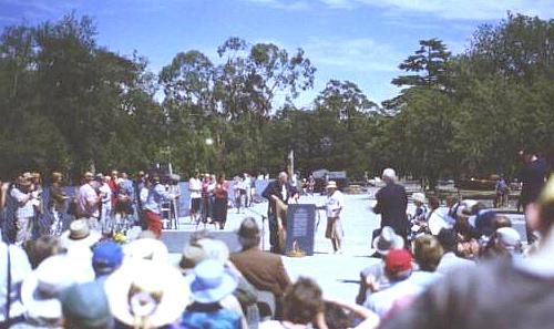 7 February, 2004 at 11.00 AM was a very warm morning with brilliant sunshine where some 500-600 people gathered at the Ballarat Botanical Gardens to dedicate a Monument and pay tribute to those who lost their lives on the Montevideo Maru 1 July 1942. The Presiding Officer was Brigadier Keith Rossi, AM, OBE, RFD, ED - RSL Historian.