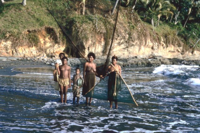 Kerema 1963. Fishing nets were dipped into the waves to get small shellfish - the nets were woven from cord from vehicle tyres.