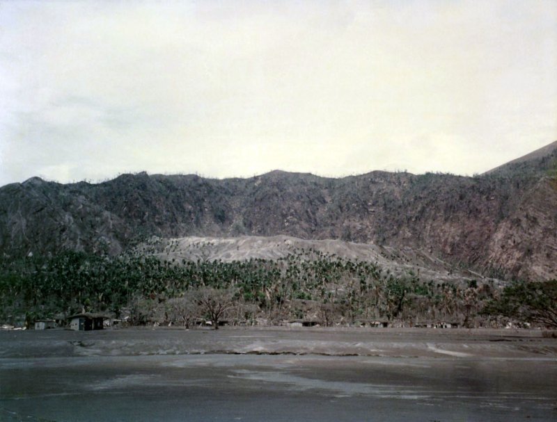 Rabalanakaia dwarfs the administration buildings at Rabaul airport