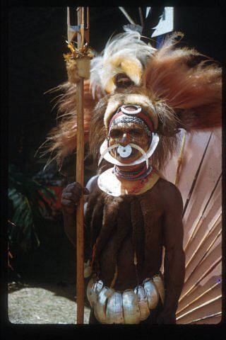 From memory, a Chimbu native - note the yellow and red Birds of Paradise in his head-dress.