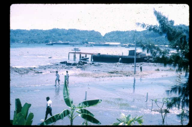 Rabaul harbour - water receding fast to below normal levels - note items on harbour floor not normally seen and normal tide mark on wharf