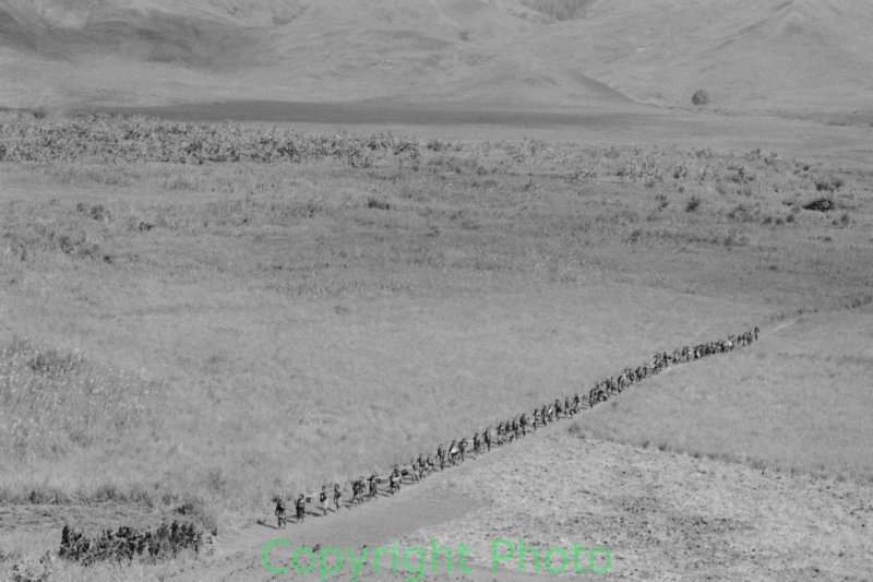 A patrol line files across a valley floor in the Chimbu area, 1939. Photograph: Ian Skinner. Courtesy The Skinner Family