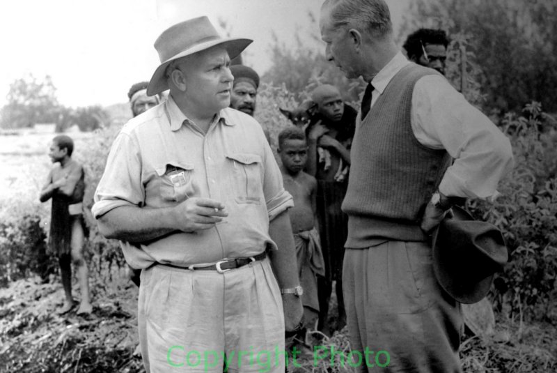 Danny Leahy chatting with the head of a UNO delegation to Mount Hagen in 1958. AIS Photo: The Ian Skinner Collection