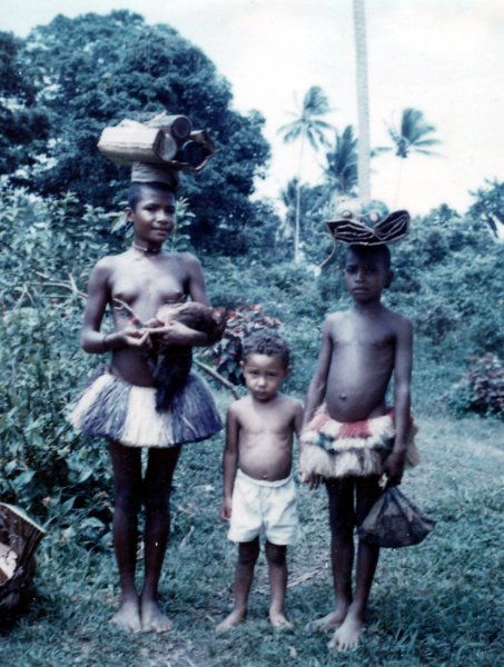 My son with girls taking food to a "Sagari" ceremony after a person's death